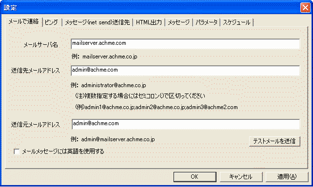 ただ「メールサーバ名」で設定したメールサーバがスパム対策で、実在するユーザからのメールしか許可しない場合があります。その場合には、この「送信元メールアドレス」を「メールサーバ名」で指定したサーバに実在するメールアドレスを指定する必要があります。