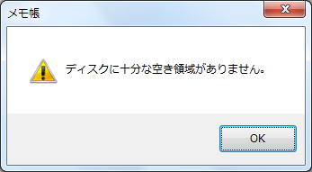 サイズがリミットに達していてファイルが保存できない場合でも、0バイトのファイルを作成る事は可能。ただしファイルに書き込もうとすると以下のエラーダイアログ(ディスクに十分な空き領域がありません)が表示される。