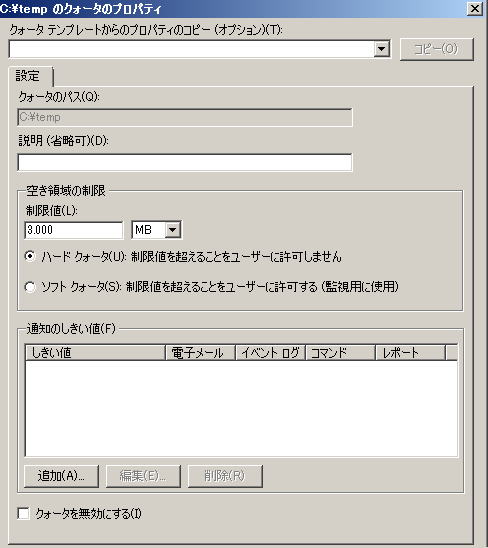 以下の例では c:\temp に 3MBのハードクォータを設定している。