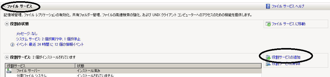 クォータの設定(ディスク使用容量制限。ユーザごとの制限など)を管理する場合、デフォルトでは機能が導入されていない。まずは「役割」として追加する作業が必要。「サーバマネージャ」の「ファイルサービス」で「役割サービスの追加」をクリック。