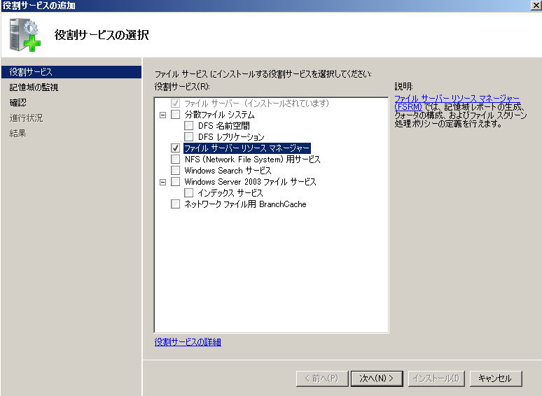 「役割サービスの選択」で「ファイルサーバーリソースマネージャー」をチェックする。