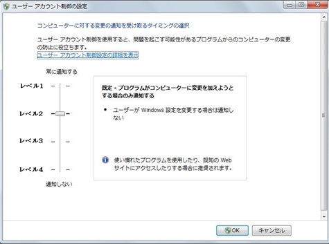| レベル1 | 昇格必要 | 昇格必要 | ロック有り | Vistaと同様に一番厳しい制限 |