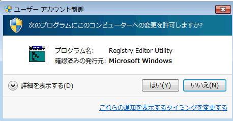 ・以下は administrator がレジストリエディタ(regedt32.exe)を実行した場合に表示される UAC の画面。administratorが[はい]をクリックするとレジストリエディタが起動される。