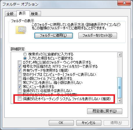 デフォルトではシステムファイル属性がついたファイルは表示されません。「保護されたオペレーティングシステム ファイルを表示しない」をチェックするとシステムファイルも表示されます。