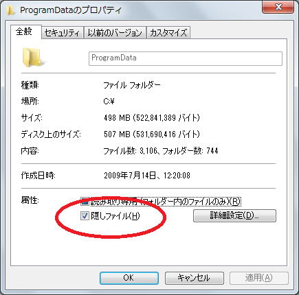 隠しファイルはエクスプローラのプロパティで「隠しファイル」がチェックされています。