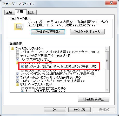 チェックオンにすると、「隠しファイル」属性のファイルがエクスプローラ上で表示されます。デフォルトでは隠しファイルは表示されません。